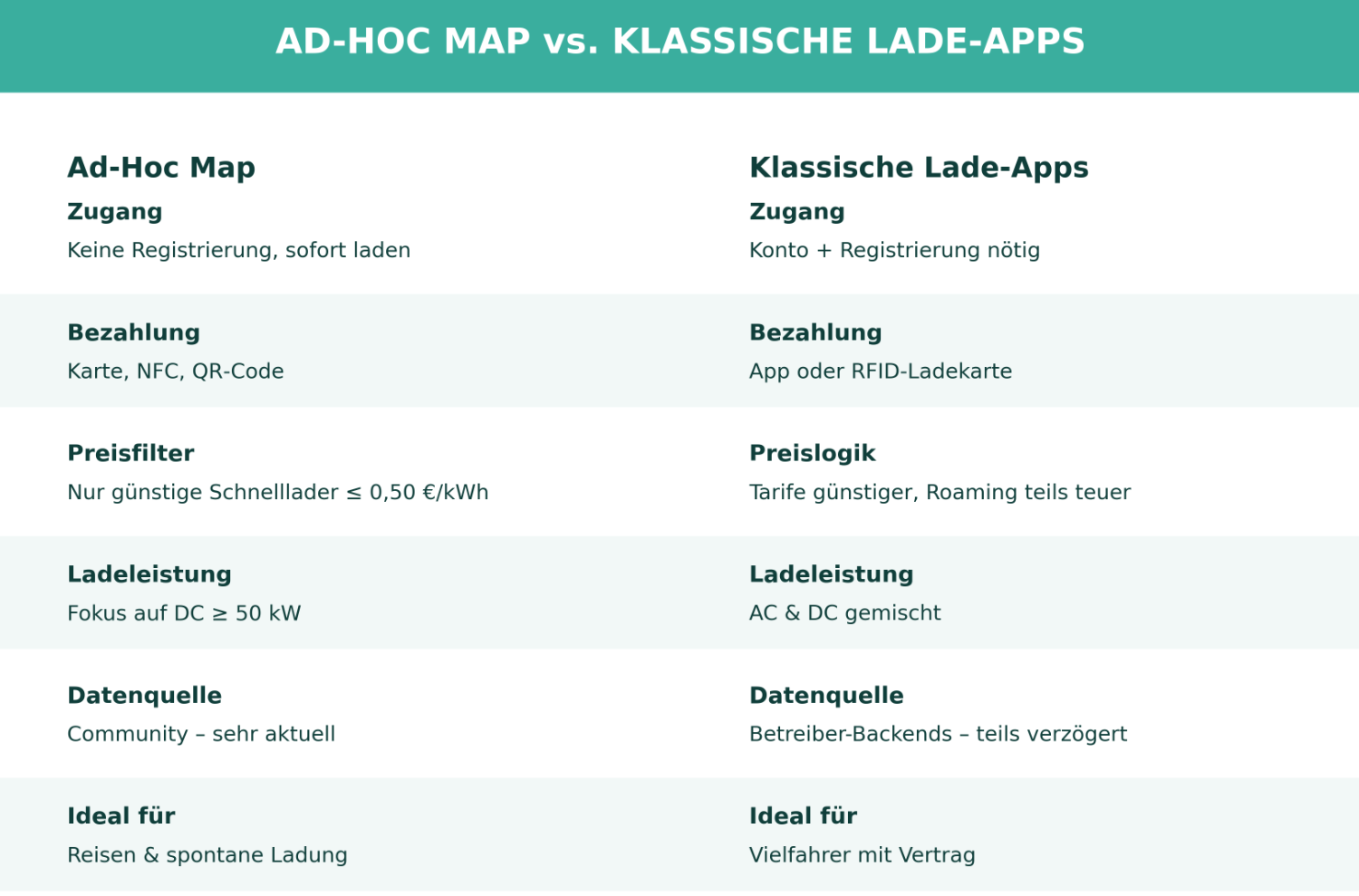 Die Ad-Hoc Map unterscheidet sich deutlich von klassischen Lade-Apps wie EnBW mobility+, Maingau, Shell Recharge, Plugsurfing oder Elli. Während herkömmliche Lade-Apps in erster Linie auf Vertragskunden ausgerichtet sind und Roamingtarife verwalten, verfolgt die Ad-Hoc Map einen ganz anderen Ansatz: Sie zeigt nur solche Ladestationen, an denen man spontan, ohne Registrierung und möglichst günstig laden kann. Dadurch grenzt sie sich klar vom typischen Funktionsumfang anderer Apps ab.