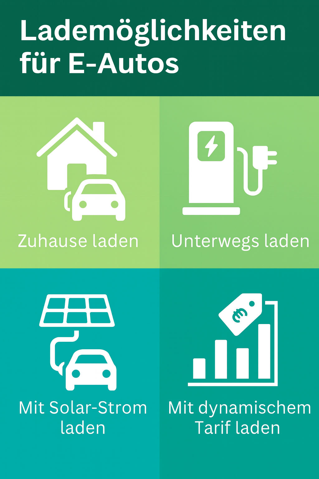 Grundsätzlich lassen sich die Lademöglichkeiten für E-Autos in zwei Hauptbereiche einteilen: das Laden zuhause und das Laden unterwegs. Ergänzend kommen intelligente Konzepte wie das Laden mit Solarstrom oder dynamischen Stromtarifen hinzu. Diese Kombinationen ermöglichen es, das Elektroauto besonders effizient und kostengünstig zu betreiben.