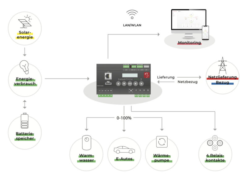 Die intelligente Technologie von SMARTFOX PRO steuert Verbraucher innerhalb Ihres Hauses automatisch mit Ihrer überschüssigen Solarenergie an und verbessert somit die Eigenverbrauchsquote Ihres Photovoltaik-Systems. SMARTFOX PRO bedeutet Konnektivität ohne Einschränkungen. Eine Vielzahl an Anbindungsmöglichkeiten bringt größtmögliche Effizienz in Ihre Anlage. Ein wesentliches Element zur Eigenverbrauchsmaximierung ist die Nutzung von Geräten wie Boiler, Wärmepumpen, Ladestationen/Wallboxen, Infrarotheizungen und Speichersystemen. Wenn die Solarenergie nicht direkt genutzt wird, bieten diese Verbraucher einen idealen Energiespeicher in Form von Wasser oder eben Strom. SMARTFOX kann sowohl in neue, als auch in allen bestehenden Systemen integriert werden. Die neue WLAN Schnittstelle garantiert einfachste und schnellstmögliche Inbetriebnahme, inklusive intelligentem Monitoring mit einzigartiger Auflösung.