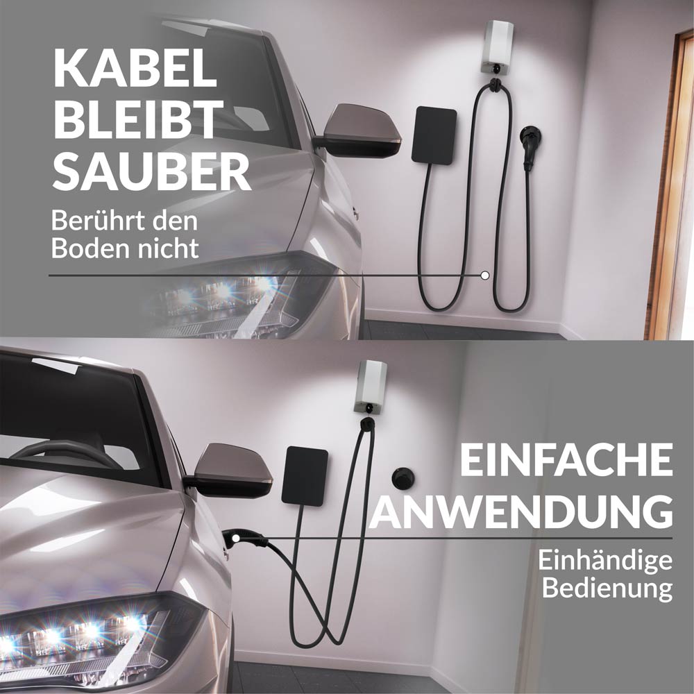 Die Kabelhalterung verfügt über einen automatischen Kabeleinzug und verhindert, dass sich das Ladekabel verdreht und mit Schmutz am Boden in Berührung kommt. Das innovative Produkt bringt endlich Ordnung in den Kabeldschungel und erleichtert Ihren Ladealltag. Kein verdrehtes Kabel mehr, kein Aufrollen und Verstauen und vor allem: keine schmutzigen Hände mehr. Schnell und unkompliziert laden, wie es sein sollte. Bei Ihnen zuhause, oder auch bei Ihren Mitarbeitern oder Kunden.